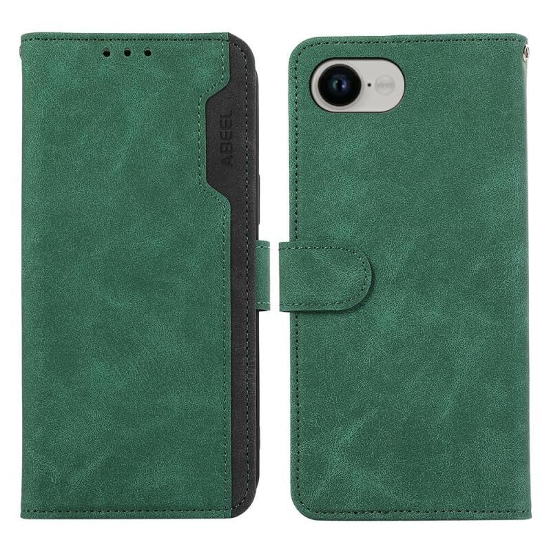 Θήκη τηλεφώνου από δέρμα με μαγνητικό κλείσιμο και προστασία RFID για iPhone 16e ABEEL, σε χρώματα μπλε-καφέ.