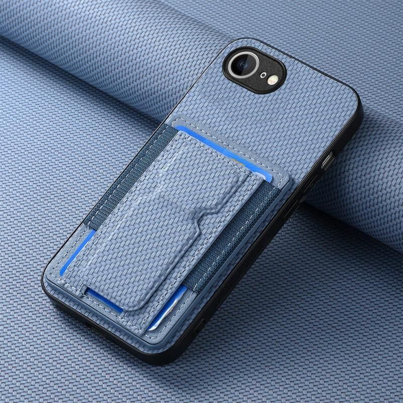 For iPhone 16e Carbon Fiber Fold Stand Elastic Card Bag Phone Case(Blue)