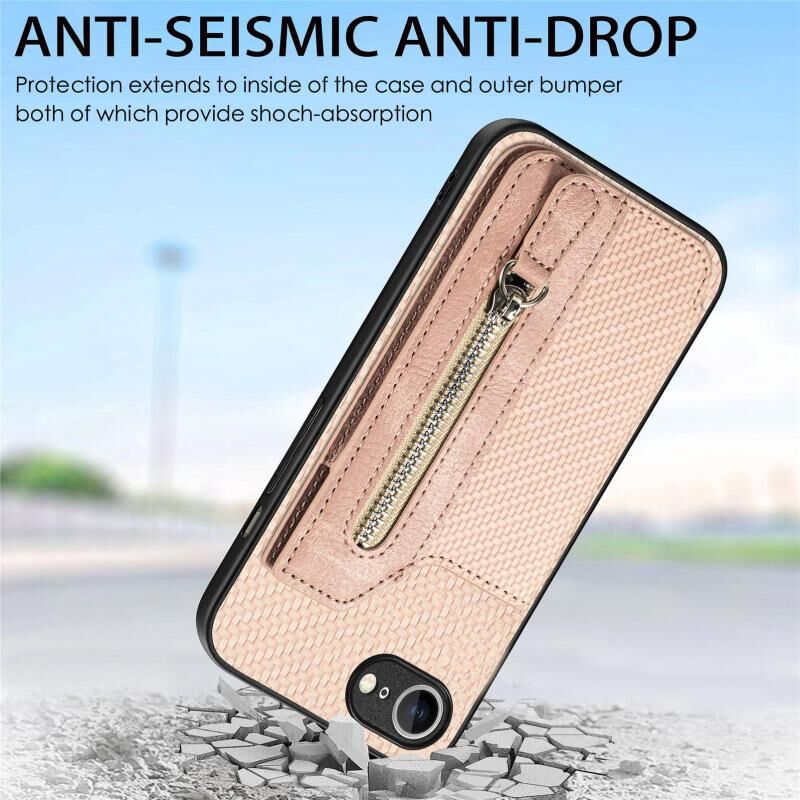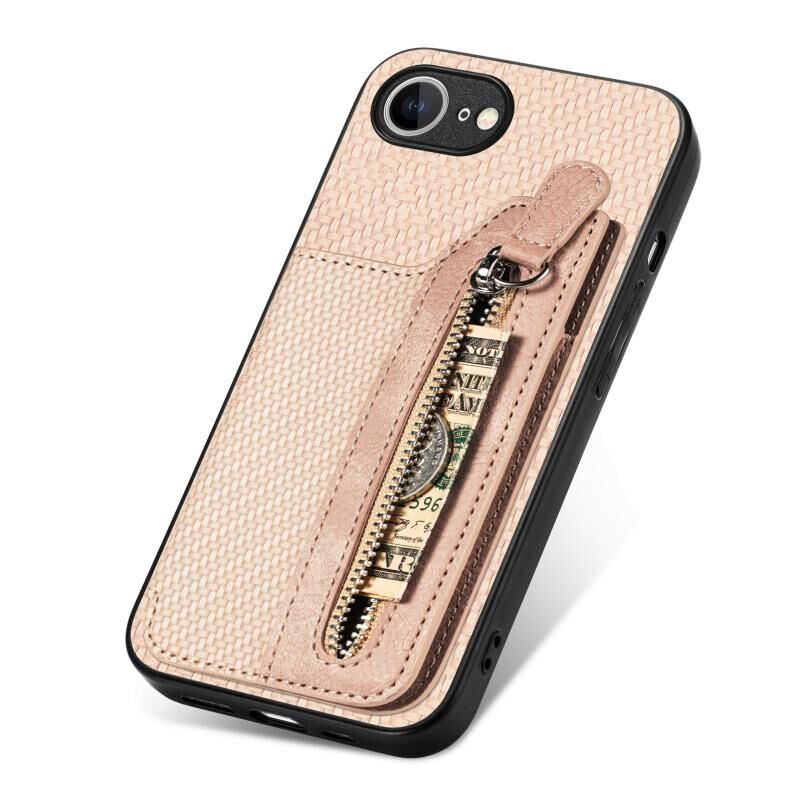 For iPhone 16e Carbon Fiber Horizontal Flip Zipper Wallet Phone Case(Khaki)