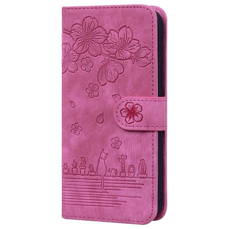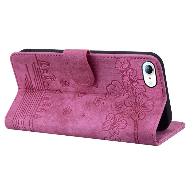 For iPhone 16e Cartoon Sakura Cat Embossed Leather Phone Case(Rose Red)