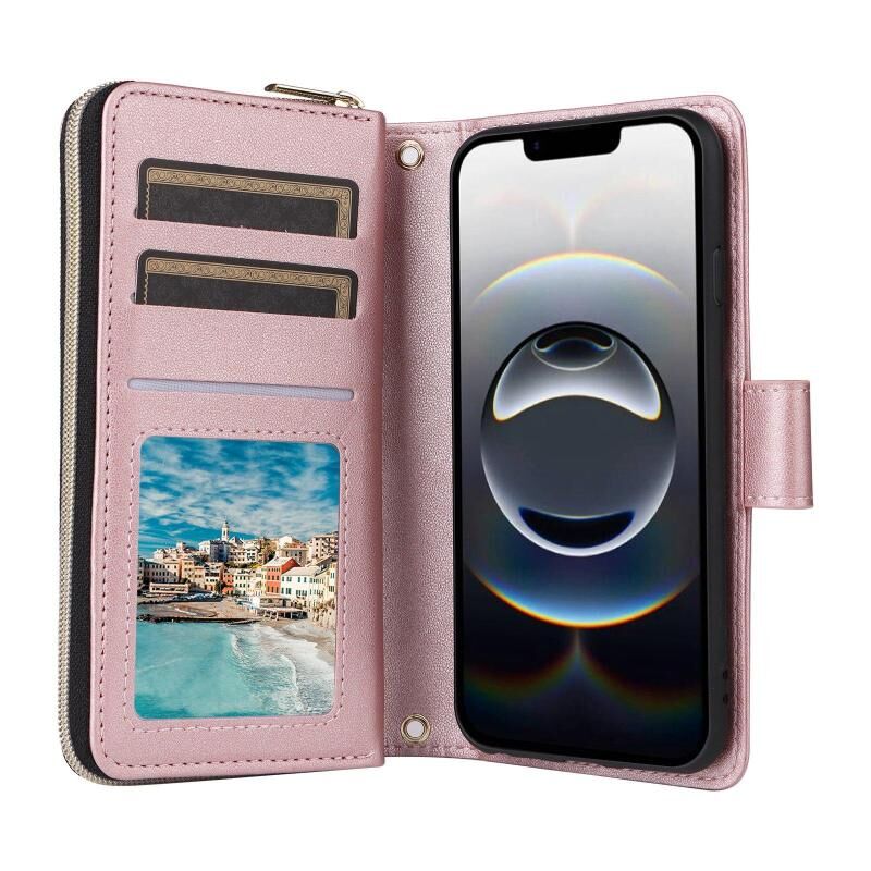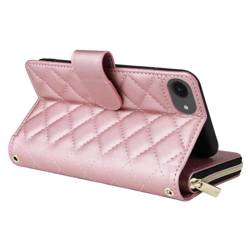 For iPhone 16e Crossbody Rhombic Zipper Tower Buckle Leather Phone Case with Lanyard(Rose Gold)