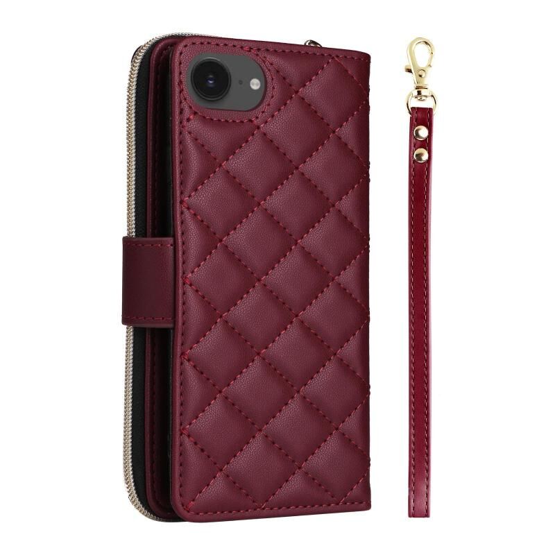 For iPhone 16e Crossbody Rhombic Zipper Tower Buckle Leather Phone Case with Lanyard(Wine Red)