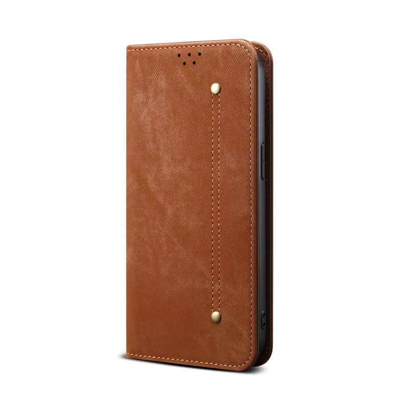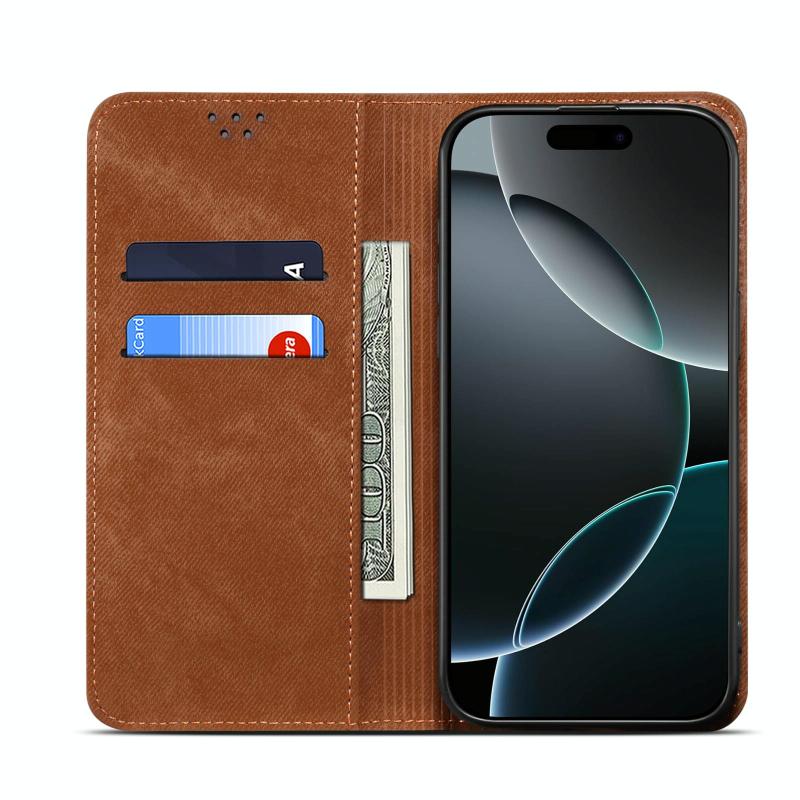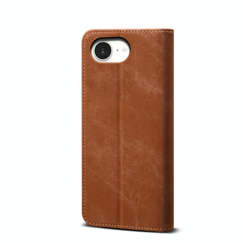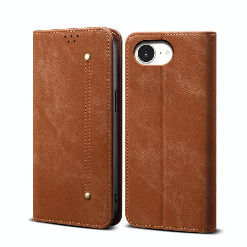 Θήκη δέρματος οριζόντιας αναδίπλωσης για iPhone 16e με υφή τζιν, casual στυλ (Καφέ)