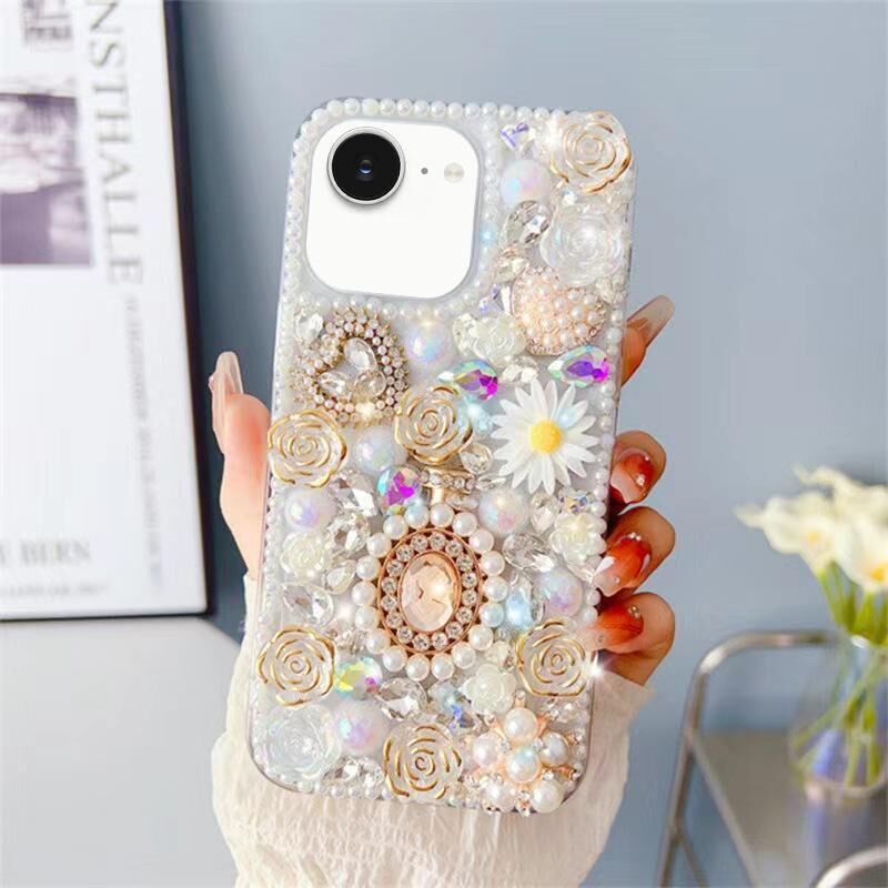 For iPhone 16e Diamond Inlaid Rose PC Phone Case(White)