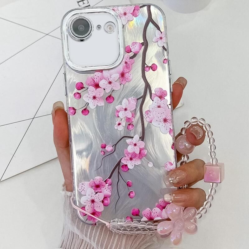 For iPhone 16e Electroplating Flowers Plants Texture Wristband TPU Phone Case(Plum Flower FL6)
