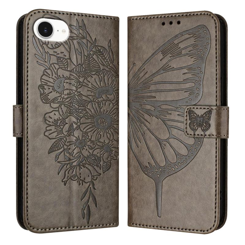For iPhone 16e Embossed Butterfly Leather Phone Case(Grey)
