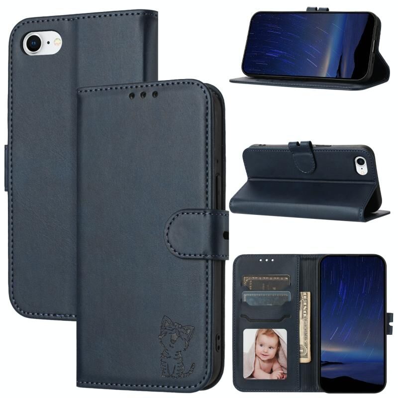 Θήκη τηλεφώνου από δέρμα με σχέδιο χαρούμενης γάτας σε ανάγλυφο για iPhone 16e (Μπλε)