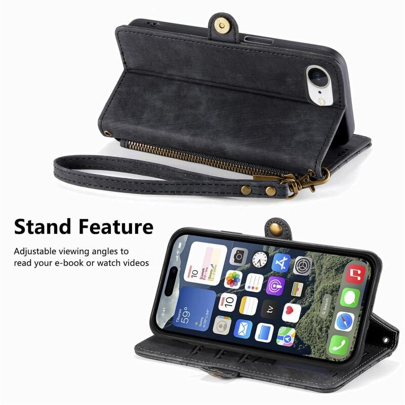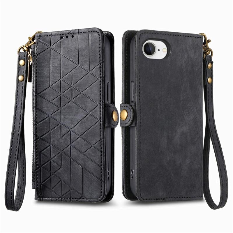 For iPhone 16e Geometric Zipper Wallet Side Buckle Leather Phone Case(Black)