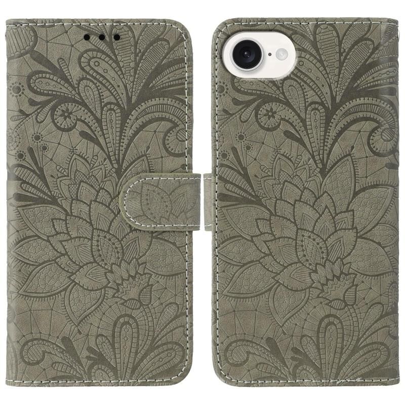 For iPhone 16e Lace Flower Embossing Flip Leather Phone Case(Grey)