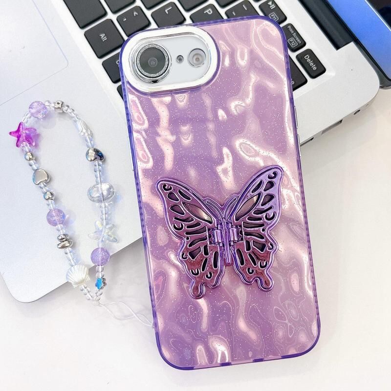 For iPhone 16e Plating Glitter Lens Film Texture Butterfly Holder Wristband Phone Case(Purple Wrinkles)