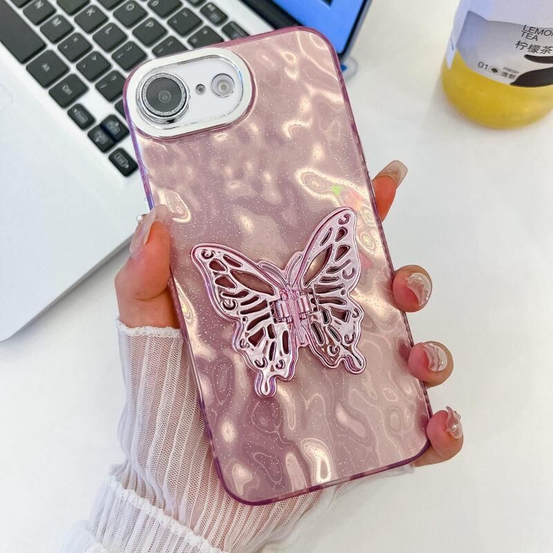 For iPhone 16e Plating Glitter Texture Butterfly Holder TPU Phone Case with Lens Film(Pink Wrinkles)
