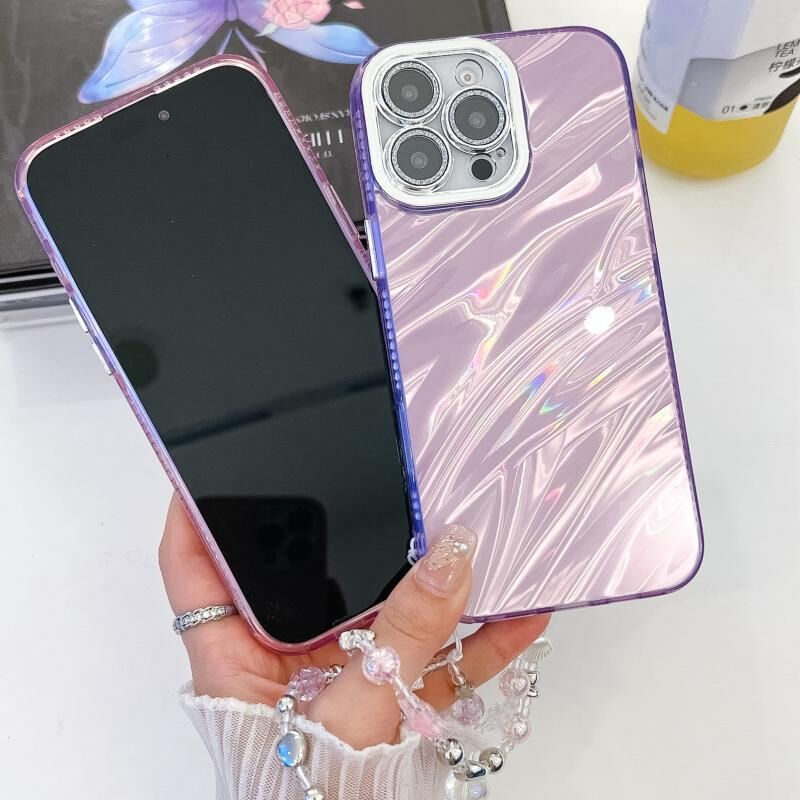Θήκη τηλεφώνου TPU με επιμετάλλωση, υφή γκλίτερ, αλυσίδα καρπού και προστατευτική μεμβράνη φακού για iPhone 16e (Λευκά Κύματα Νερού)