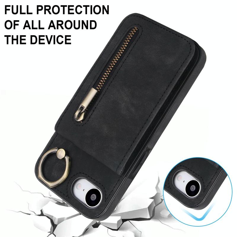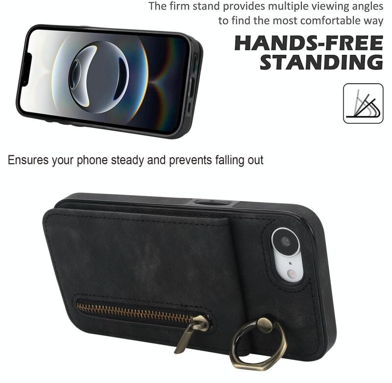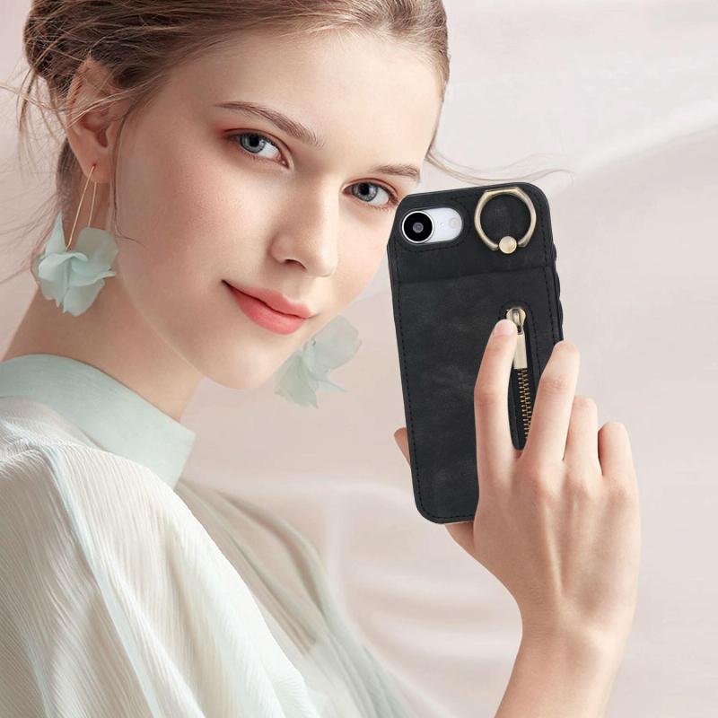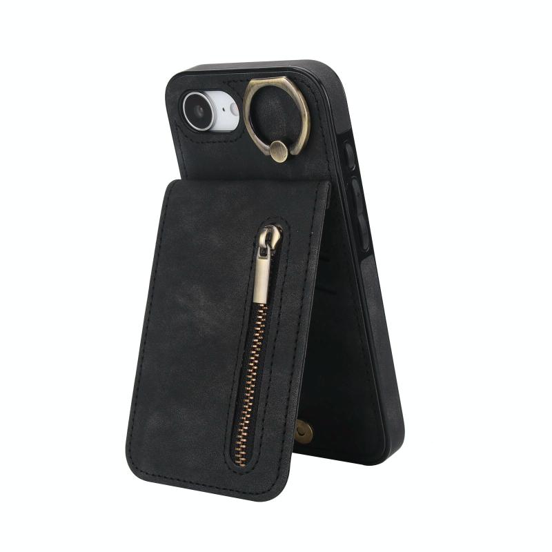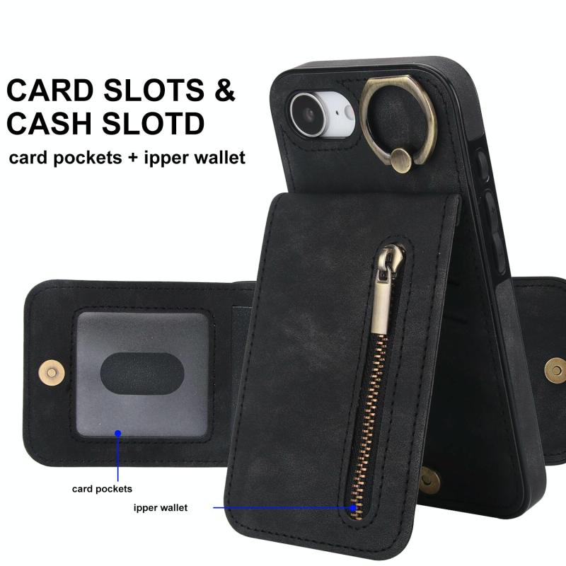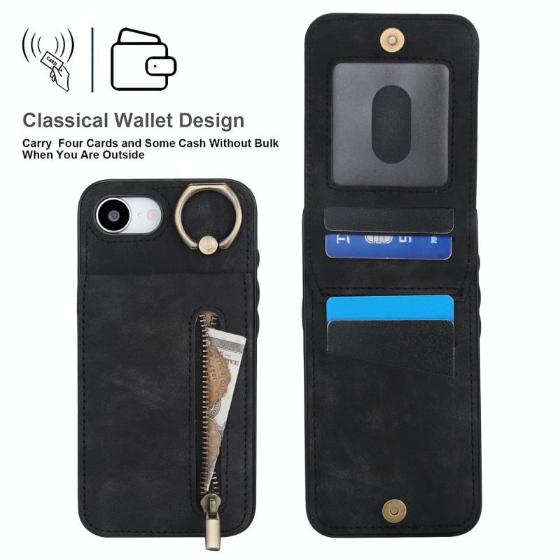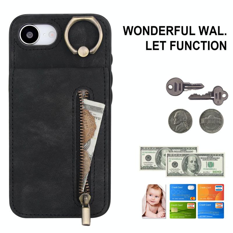 For iPhone 16e Retro Ring and Zipper RFID Card Slot Phone Case(Black)