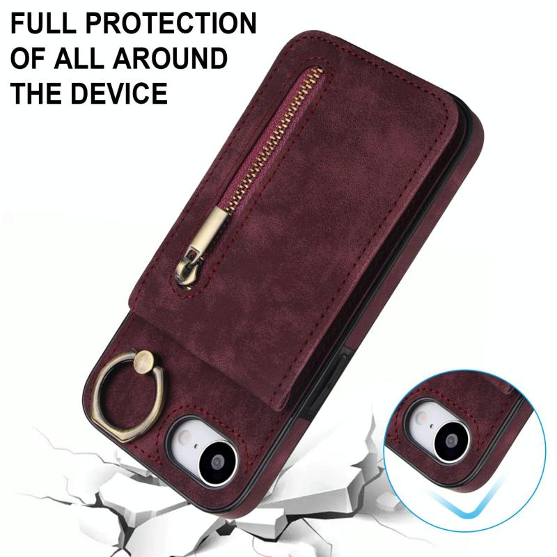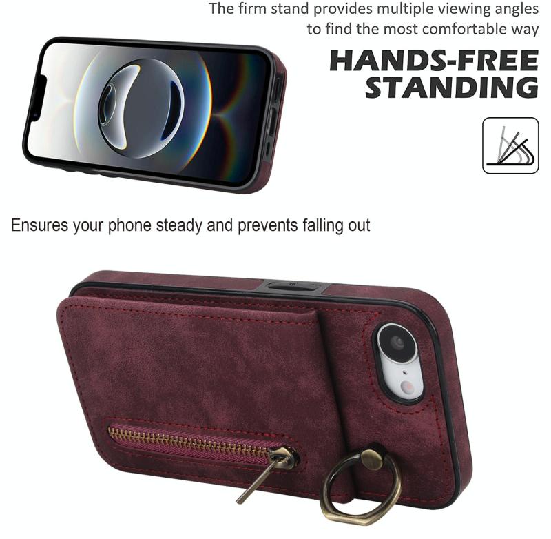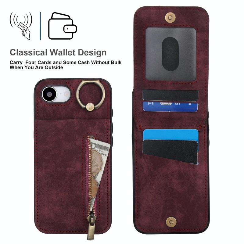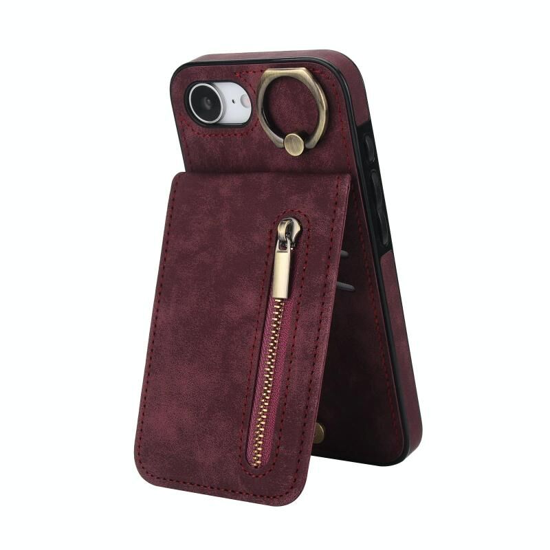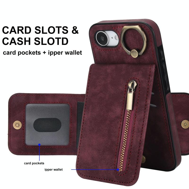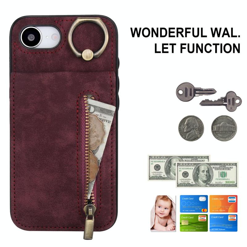 For iPhone 16e Retro Ring and Zipper RFID Card Slot Phone Case(Wine Red)