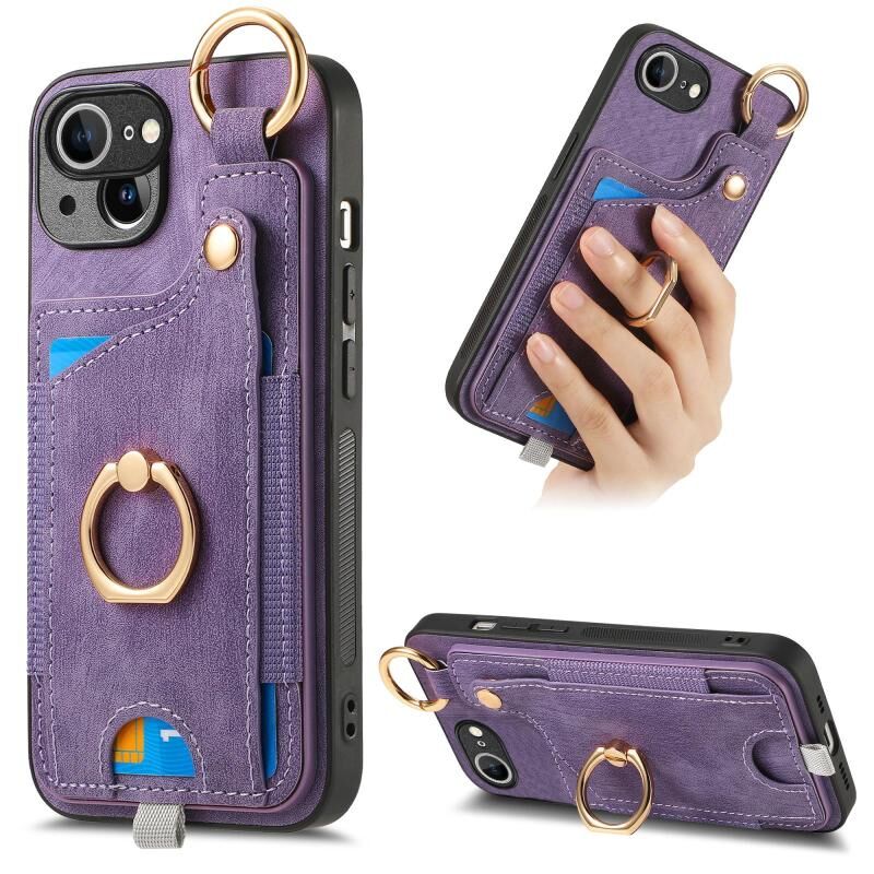 Για το iPhone 16e Ρετρό δέρμα αίσθηση δαχτυλίδι κάρτα τσάντα υπόθεση τηλεφώνου με Hang Loop (μωβ)