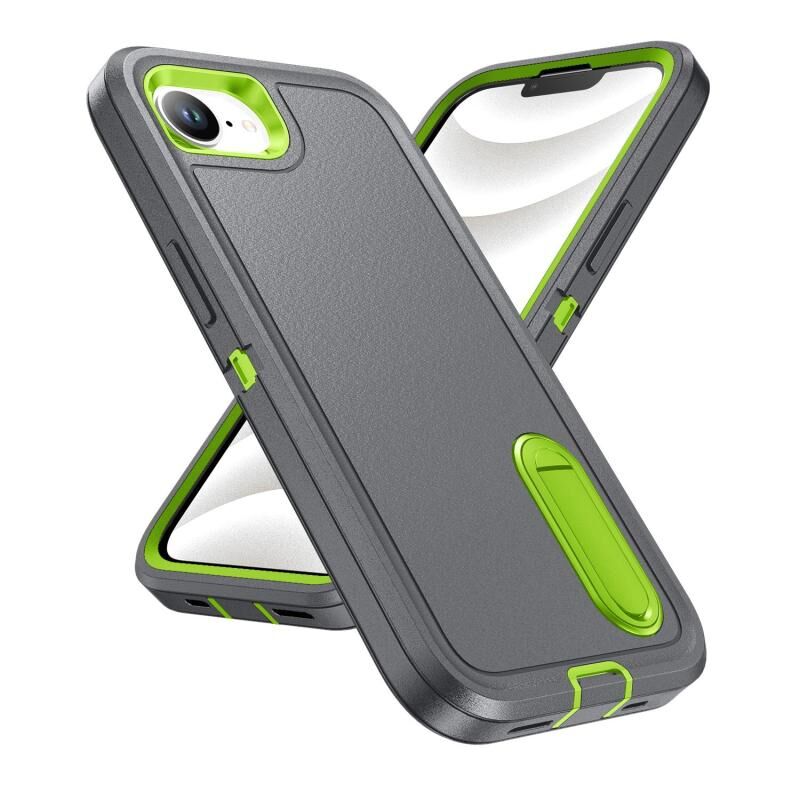 For iPhone 16e Rugged PC + Silicone Phone Case with Holder(Grey+Fresh Green)