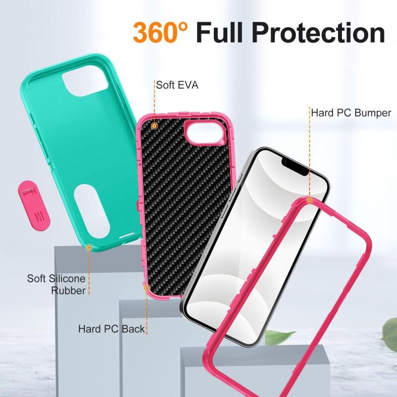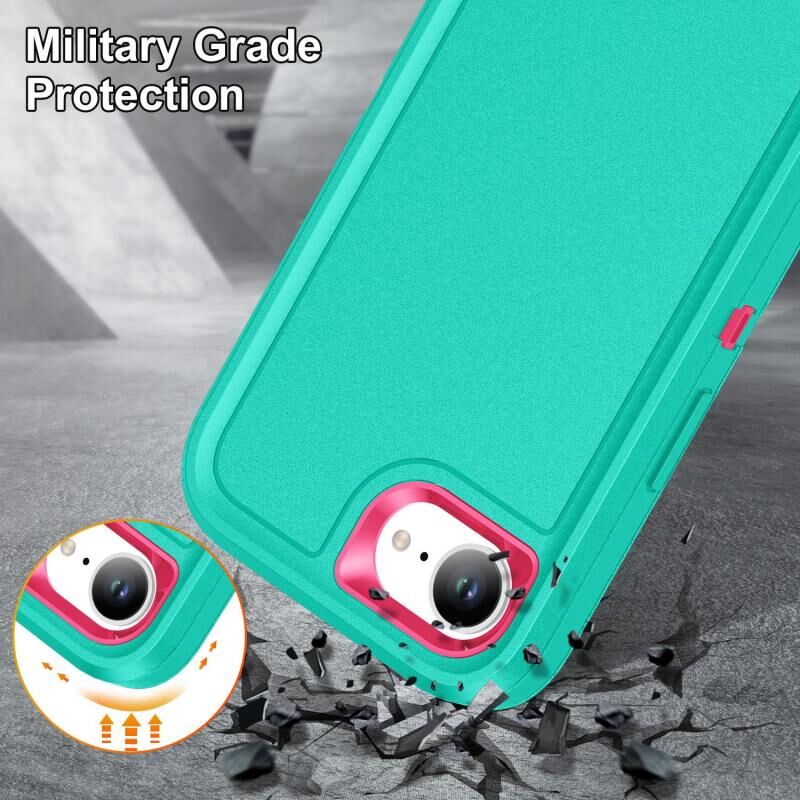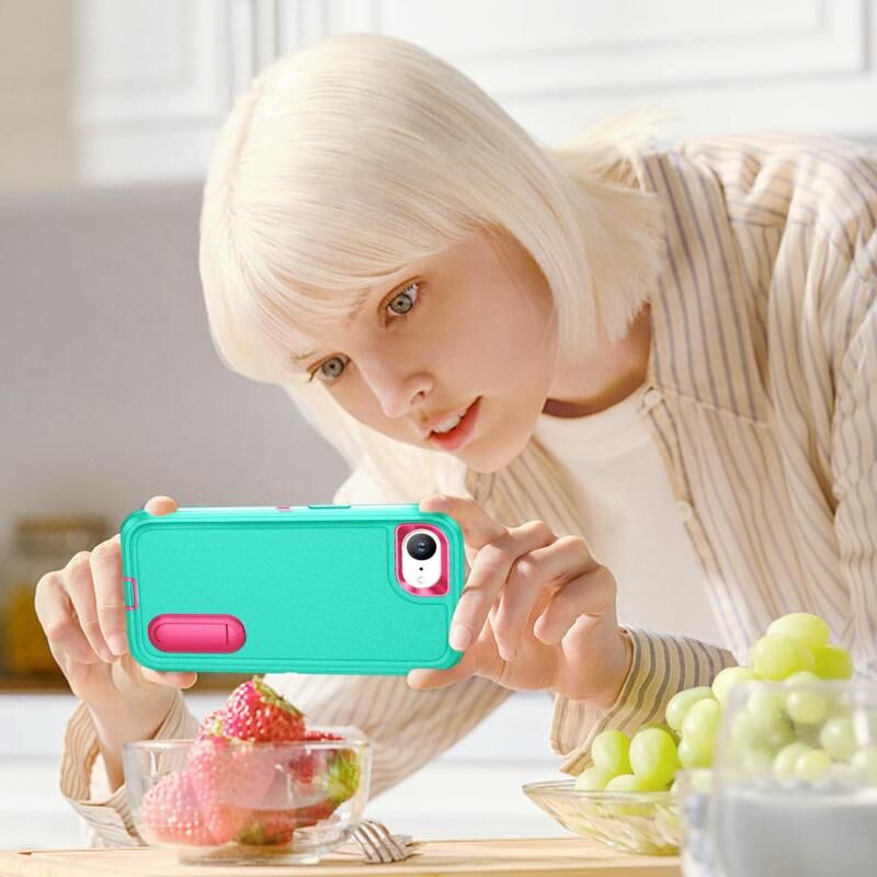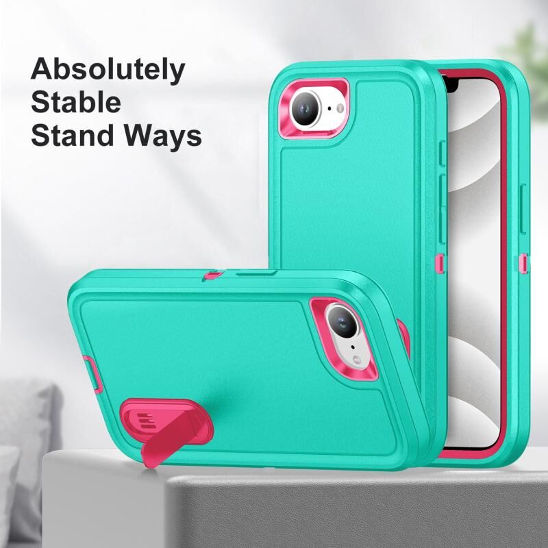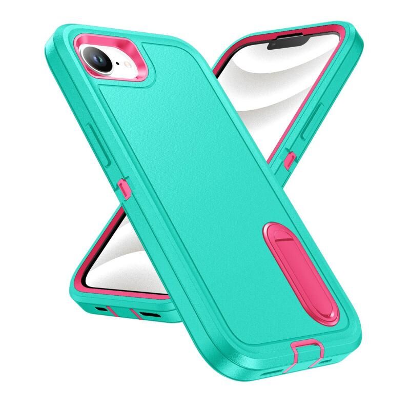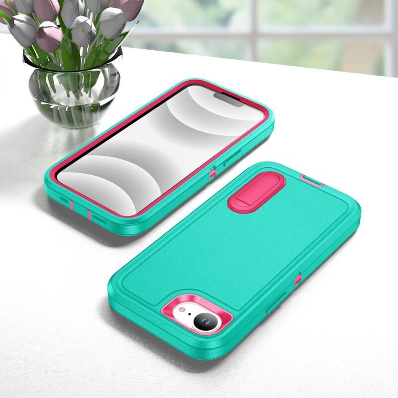 For iPhone 16e Rugged PC + Silicone Phone Case with Holder(Light Green+Rose Red)