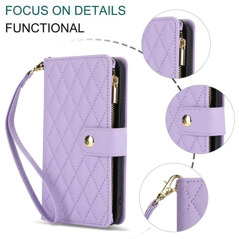 For iPhone 16e YM016 Rhombic Zipper Card Wallet Leather Phone Case with Lanyard(Light Purple)