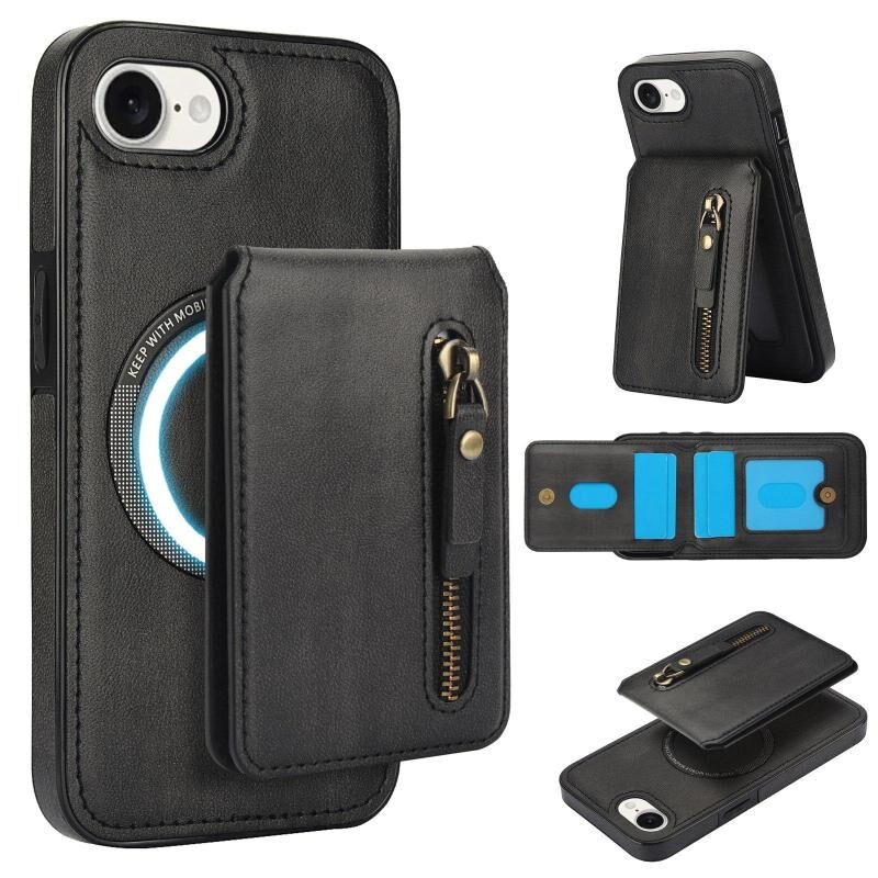 For iPhone 16e Zipper Wallet Split MagSafe Leather Back Phone Case(Black)