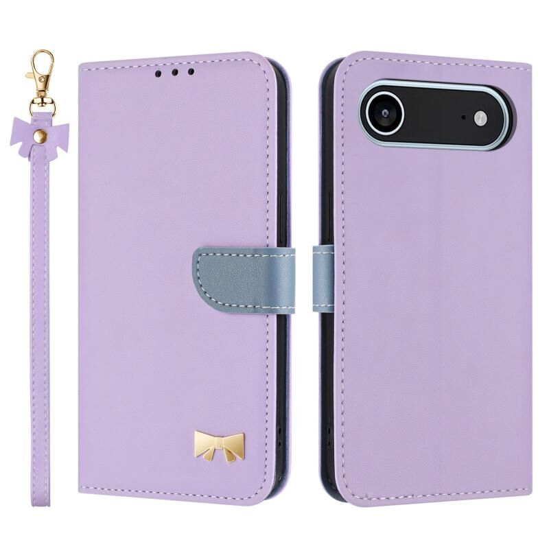 For iPhone 17 Air Metal Bow Leather Phone Case with Hand Strap(Purple)