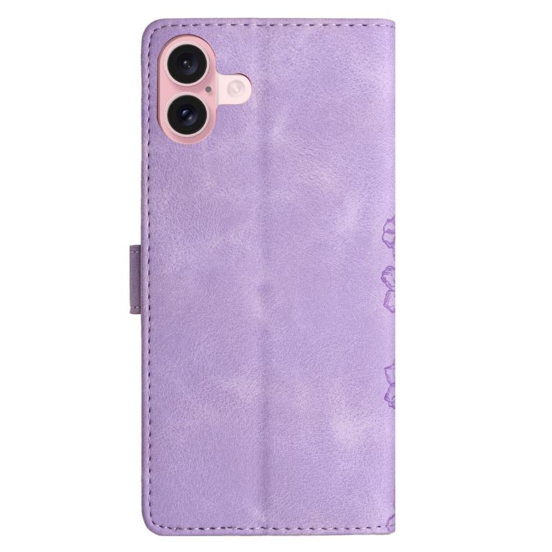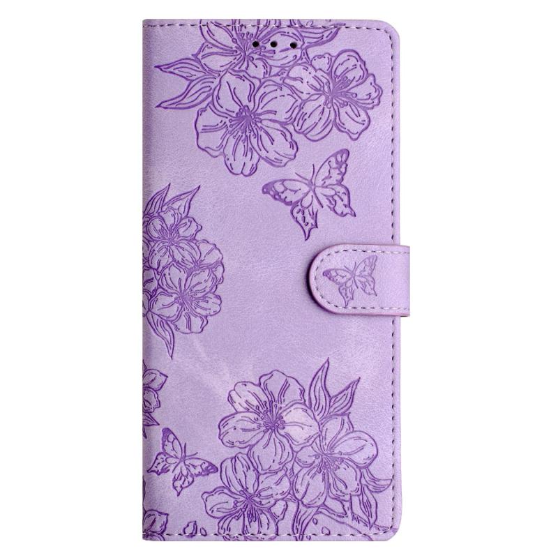 For iPhone 17 Cherry Blossom Butterfly Skin Feel Embossed PU Phone Case(Purple)