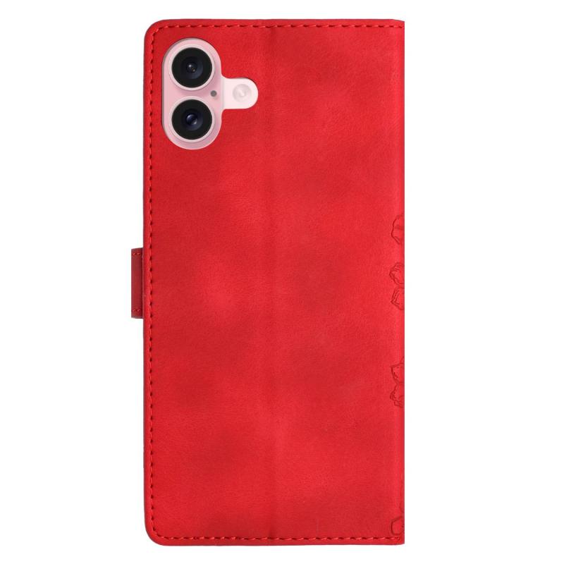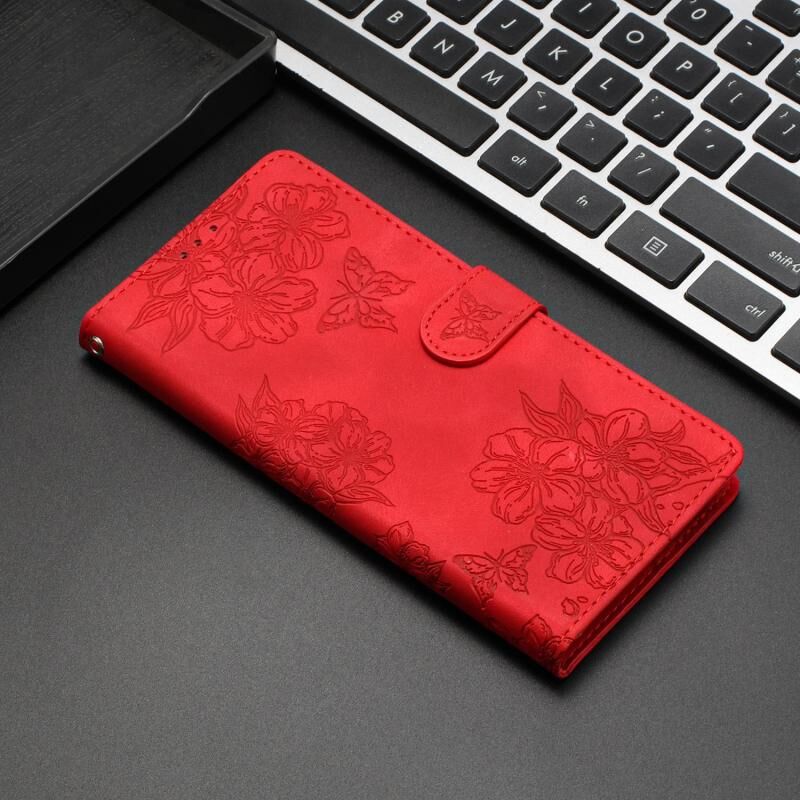 For iPhone 17 Cherry Blossom Butterfly Skin Feel Embossed PU Phone Case(Red)