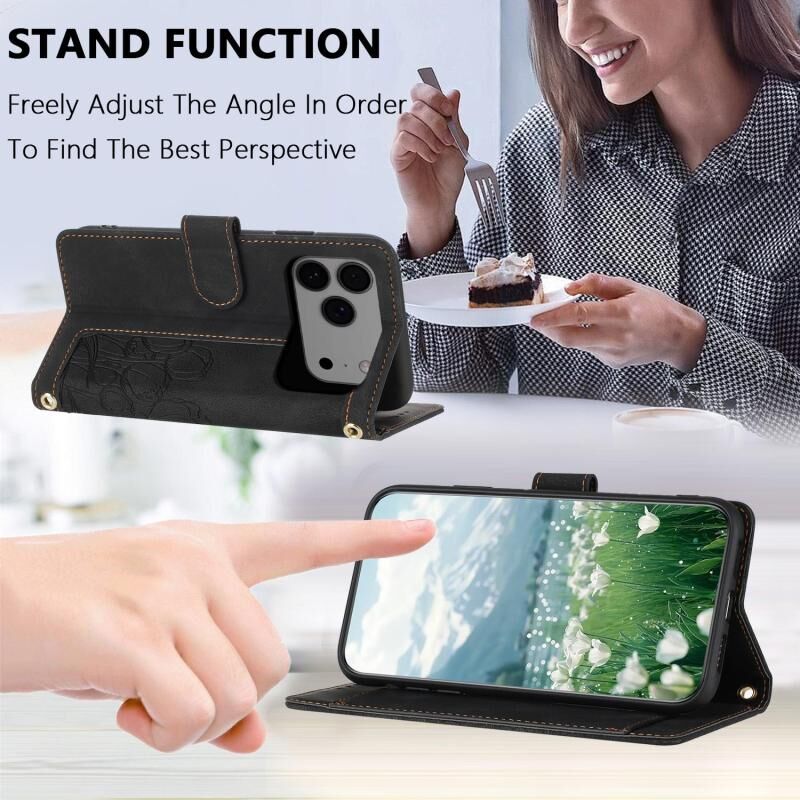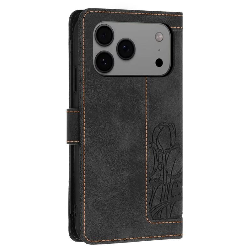 For iPhone 17 Pro Max Tulips Embossed Leather Phone Case with Lanyard(Black)