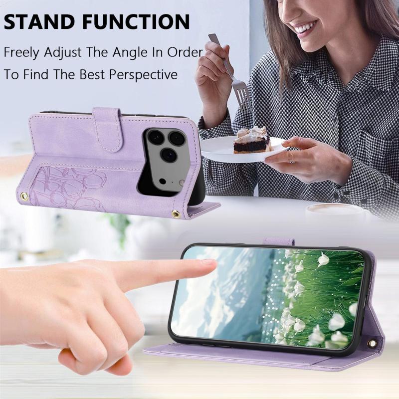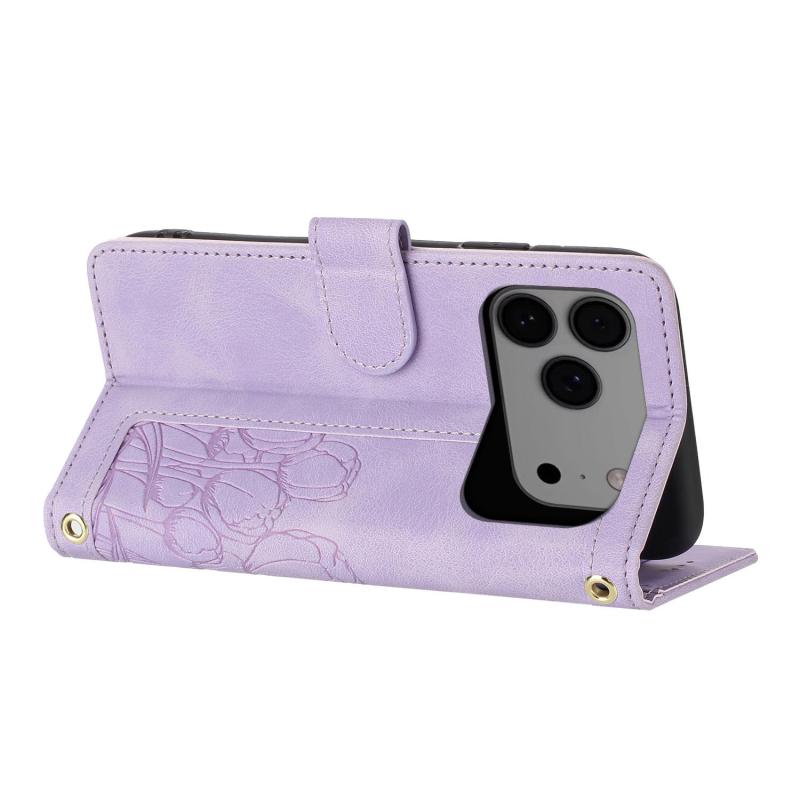 For iPhone 17 Pro Max Tulips Embossed Leather Phone Case with Lanyard(Purple)
