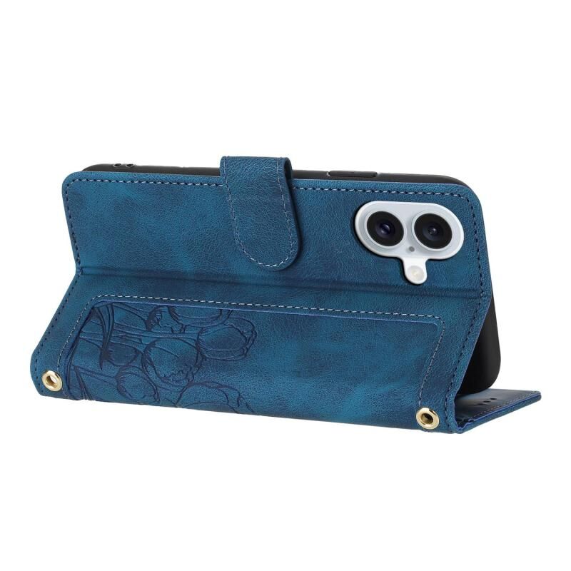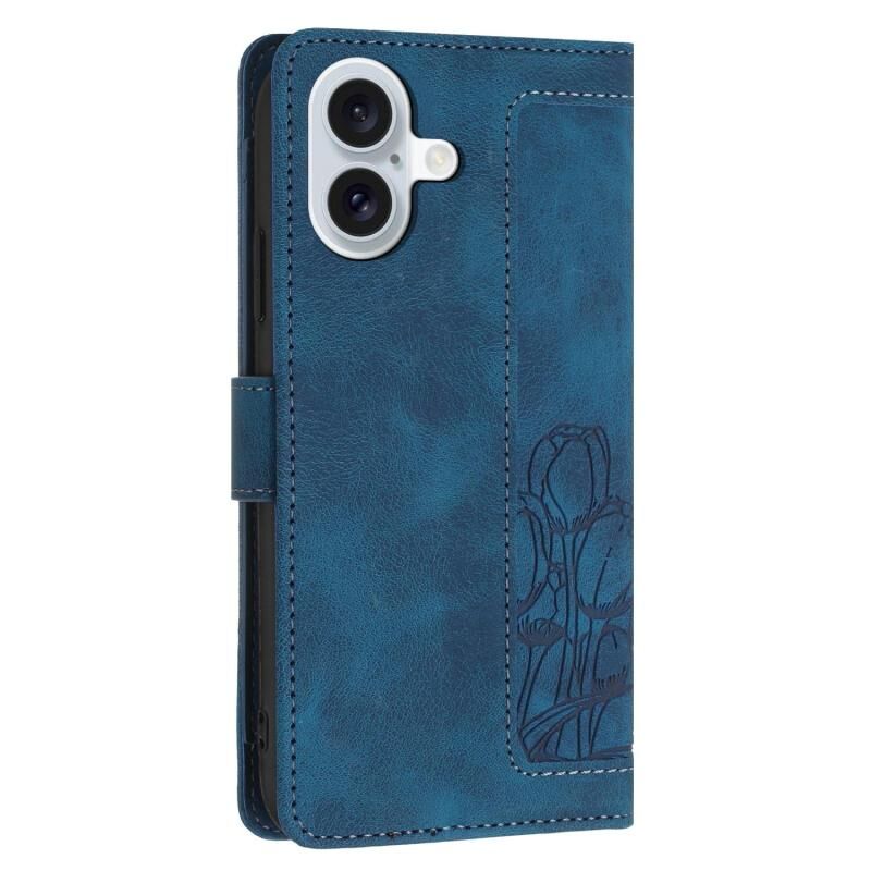For iPhone 17 Tulips Embossed Leather Phone Case with Lanyard(Blue)