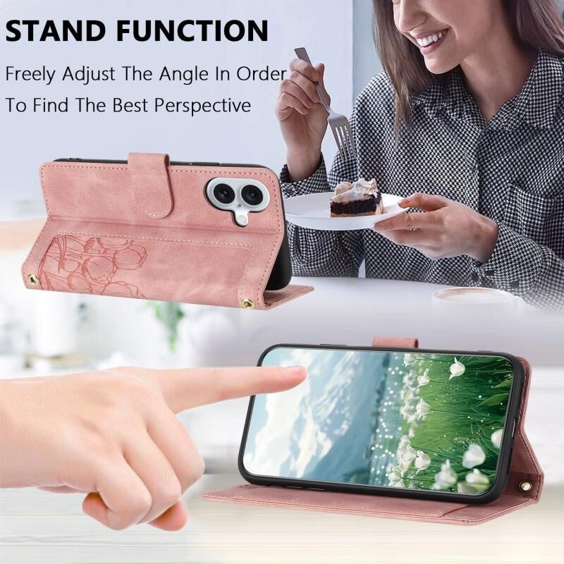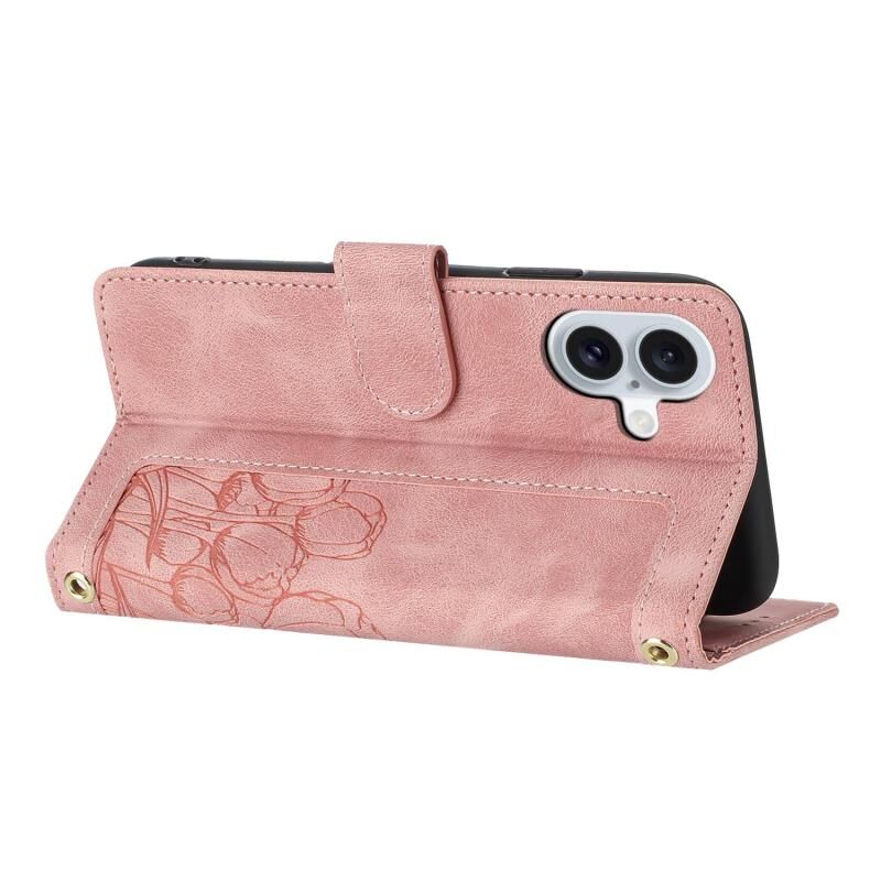 For iPhone 17 Tulips Embossed Leather Phone Case with Lanyard(Pink)