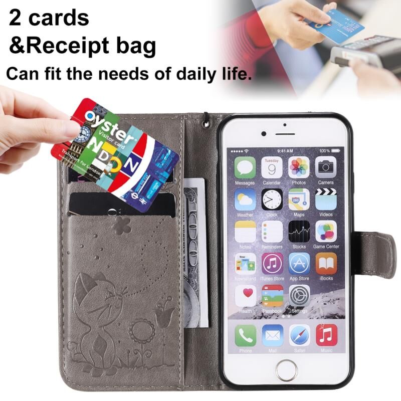 Θήκη για iPhone 6 με σχέδιο ανάγλυφου Γάτας, αντικραδασμική, οριζόντια, από δέρμα με βάση στήριξης & θήκες για κάρτες & πορτοφόλι (Γκρι)
