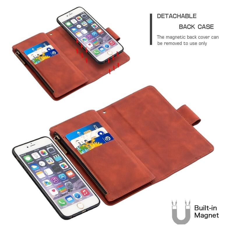 For iPhone 6 Plus Skin Feel Detachable Magnetic Zipper Horizontal Flip PU Leather Case with Multi-Card Slots & Holder & Wallet & Photo Frame & Lanyard(Brown)