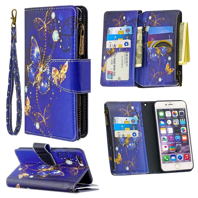 Θήκη δέρματος οριζόντιας αναδίπλωσης με φερμουάρ, με σχέδιο ζωγραφικής σε χρώμα, για iPhone 6s Plus & 6 Plus, με βάση & θήκες καρτών & πορτοφόλι (Μωβ Πεταλούδα)