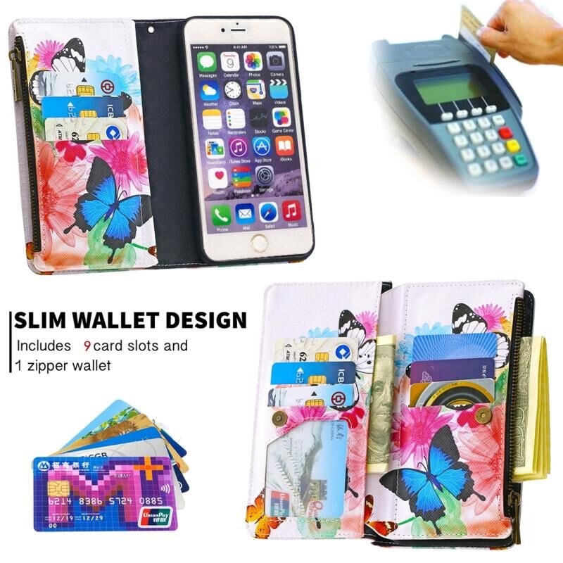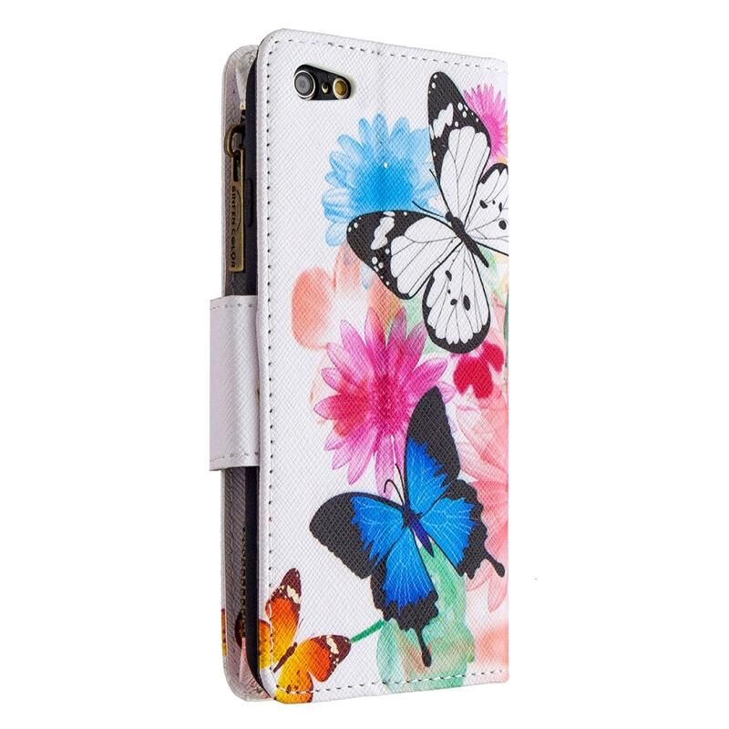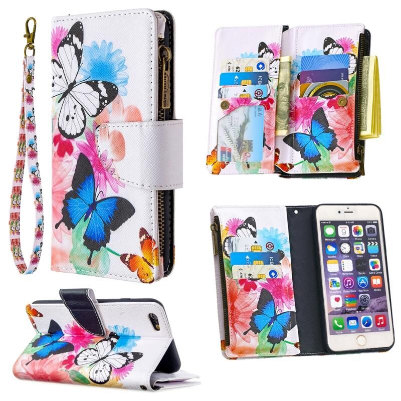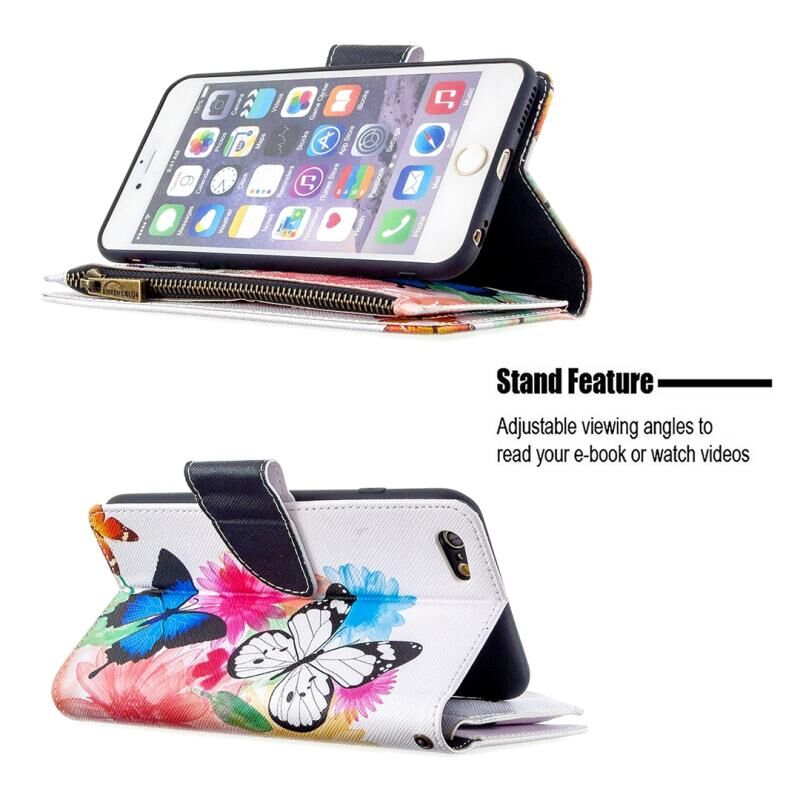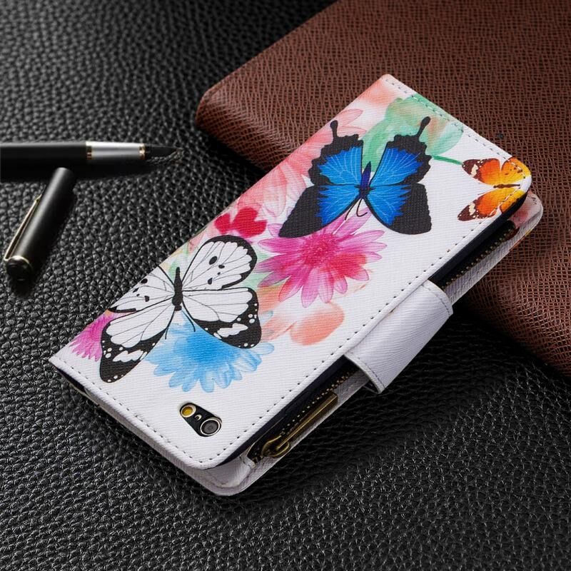 Θήκη δέρματος οριζόντιας αναδίπλωσης με φερμουάρ, με σχέδιο ζωγραφικής σε χρώματα, για iPhone 6s Plus & 6 Plus, με βάση & υποδοχές καρτών & πορτοφόλι (Δύο Πεταλούδες).