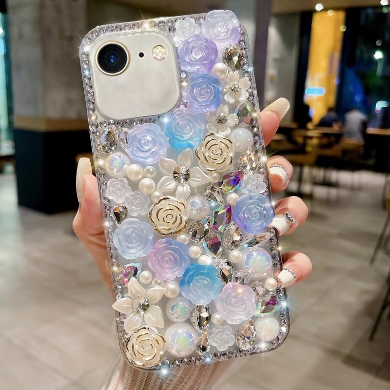For iPhone 7 / 8 Rose Hand-set Pearl Diamond PC Phone Case(Blue)