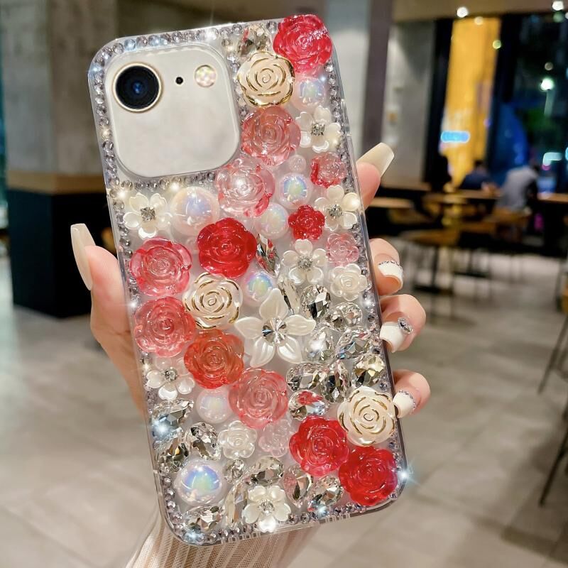 For iPhone 7 / 8 Rose Hand-set Pearl Diamond PC Phone Case(Red)