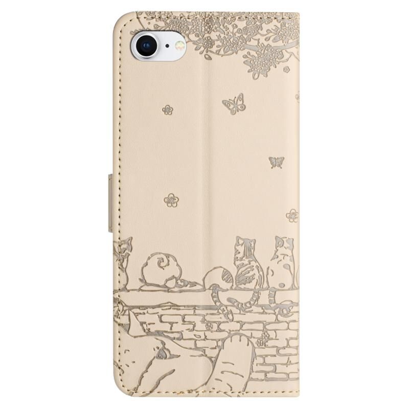 For iPhone 7 / 8 / SE 2020 / SE 2022 Cat Embossing Pattern Leather Phone Case with Lanyard(Beige)