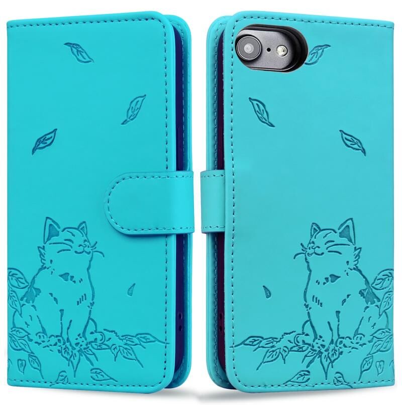 For iPhone 7 / 8 / SE 2022 Cute Cat Embossed Leather Phone Case(Lake Blue)