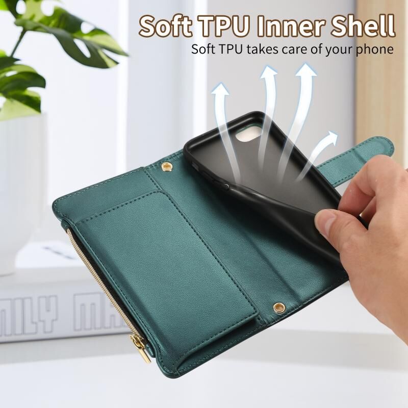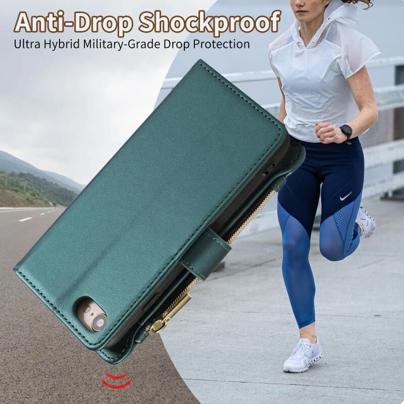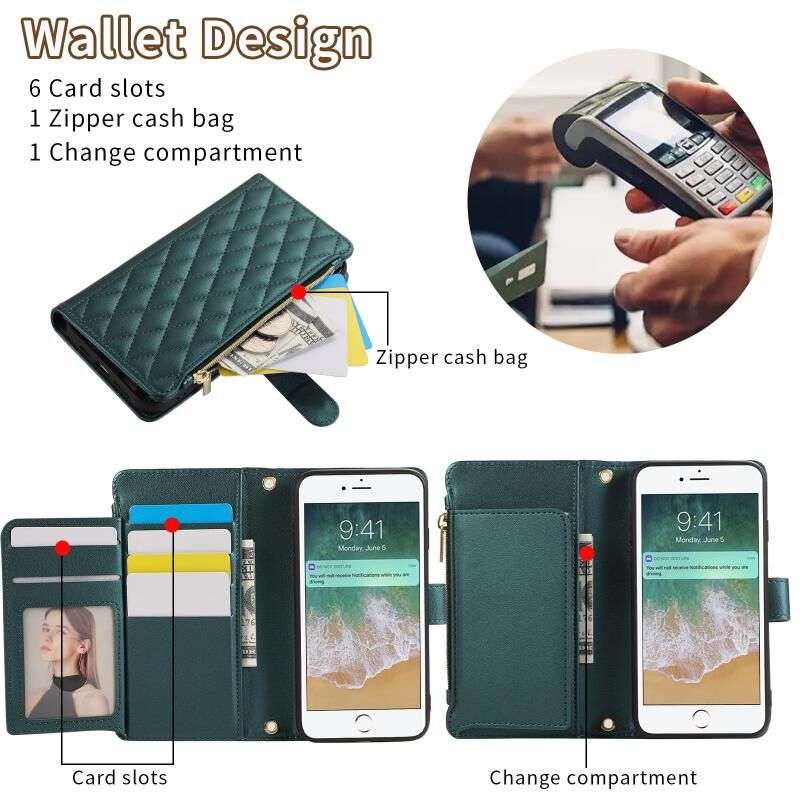5. Λειτουργία πορτοφολιού με πολλές κάρτες: Πολλαπλές υποδοχές για κάρτες και τσέπες πορτοφολιού με φερμουάρ, διαμερίσματα για μετρητά μπορούν να αποθηκεύσουν τις πιστωτικές σας κάρτες και τα καθημερινά μικρά χαρτονομίσματα.