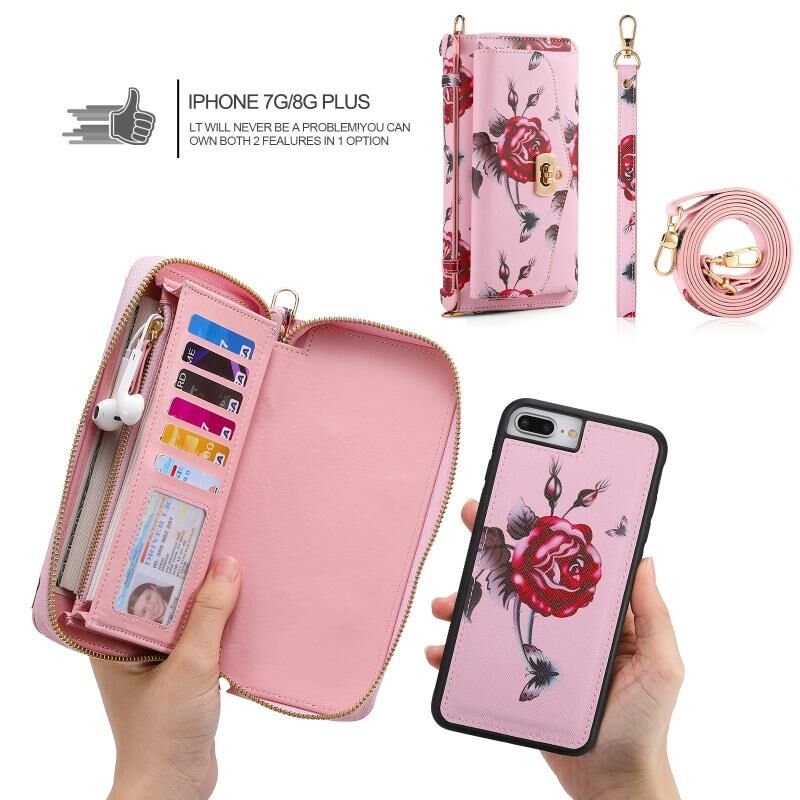 Θήκη τηλεφώνου από δέρμα με φερμουάρ, πολλαπλών λειτουργιών, τύπου τσάντας ώμου για iPhone 7 Plus / 8 Plus (Ροζ) POLA Flower.