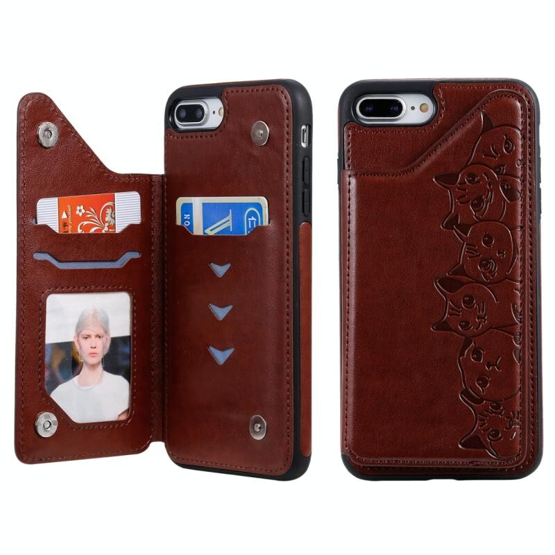 For iPhone 7 Plus / 8 Plus Six Cats Embossing Pattern Protective Case with Holder & Card Slots & Photo Frame(Brown)