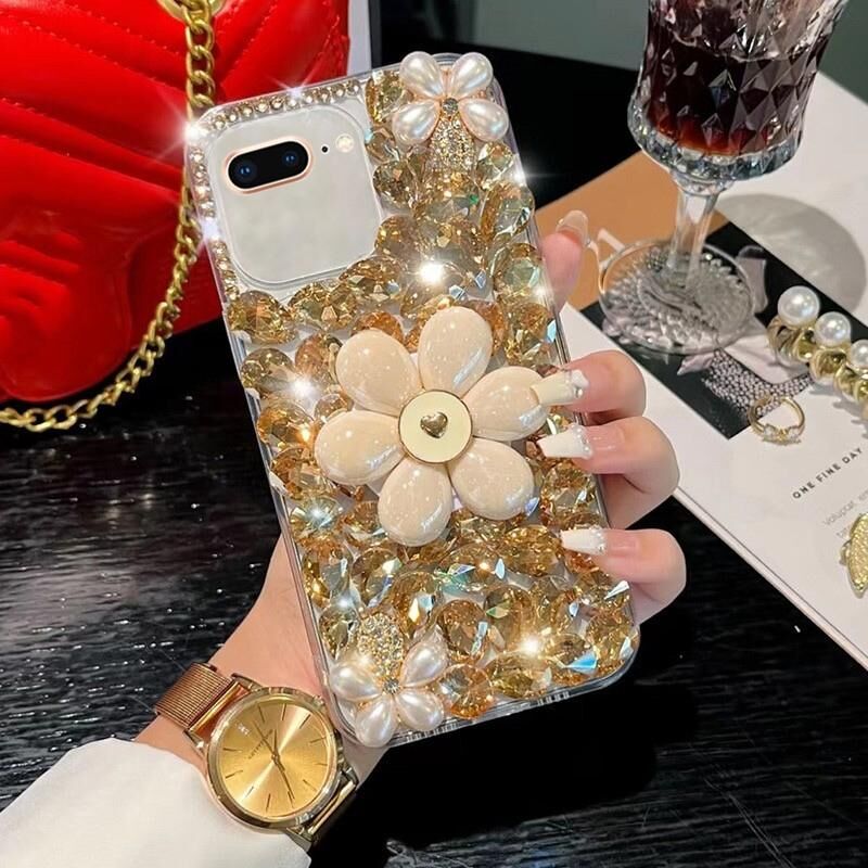Θήκη κινητού τηλεφώνου για iPhone 7 Plus / 8 Plus με σχέδιο ηλίανθου, λαβή και διαμάντια, από πολυανθρακικό (PC) (Λευκό)