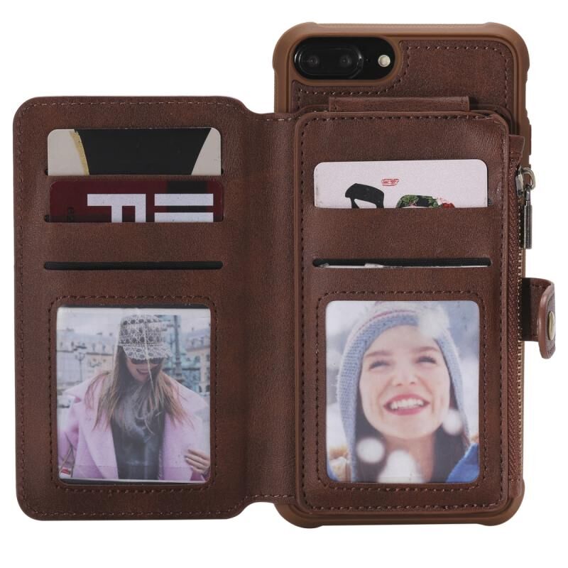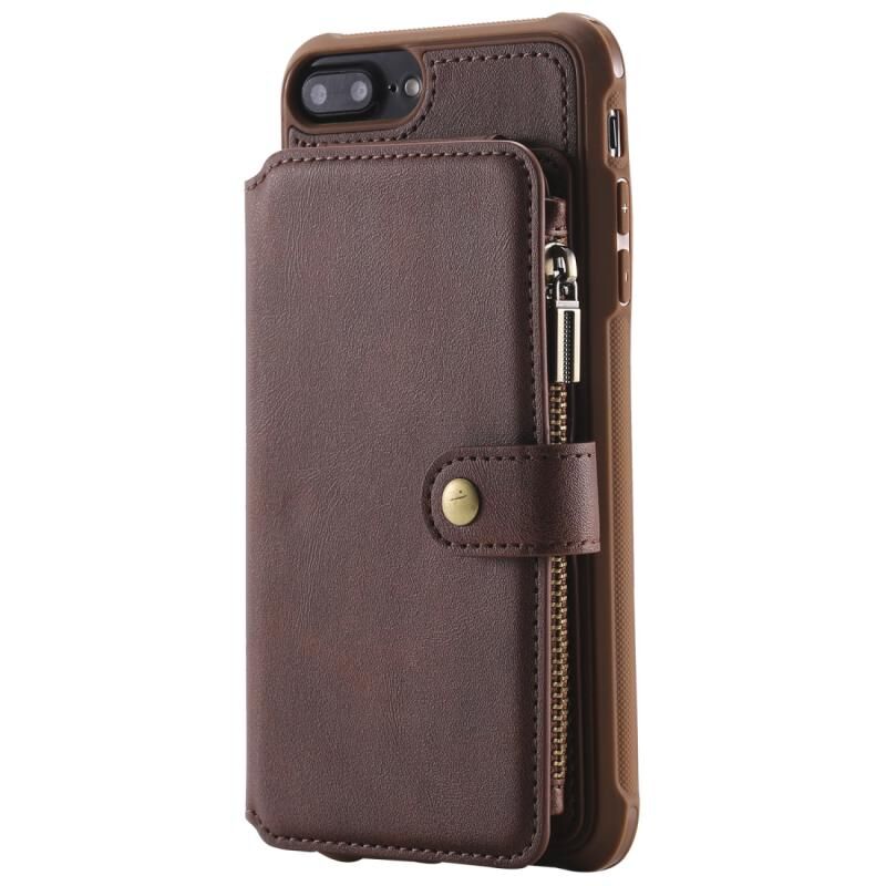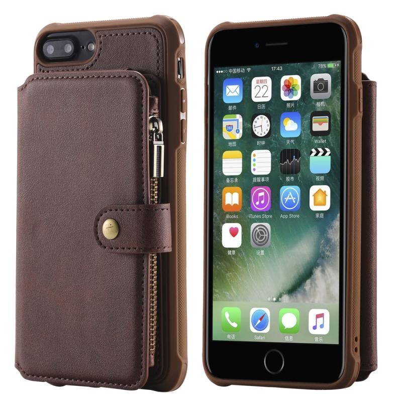 For iPhone 7 Plus / 8 Plus Zipper Shockproof Protective Case with Card Slots & Bracket & Photo Holder & Wallet Function(Coffee)
