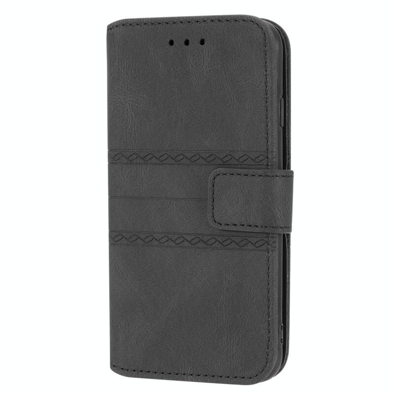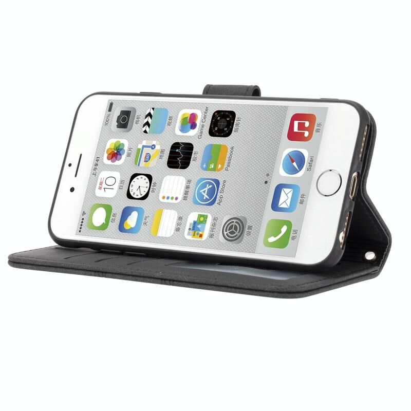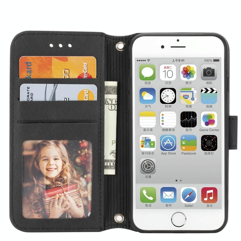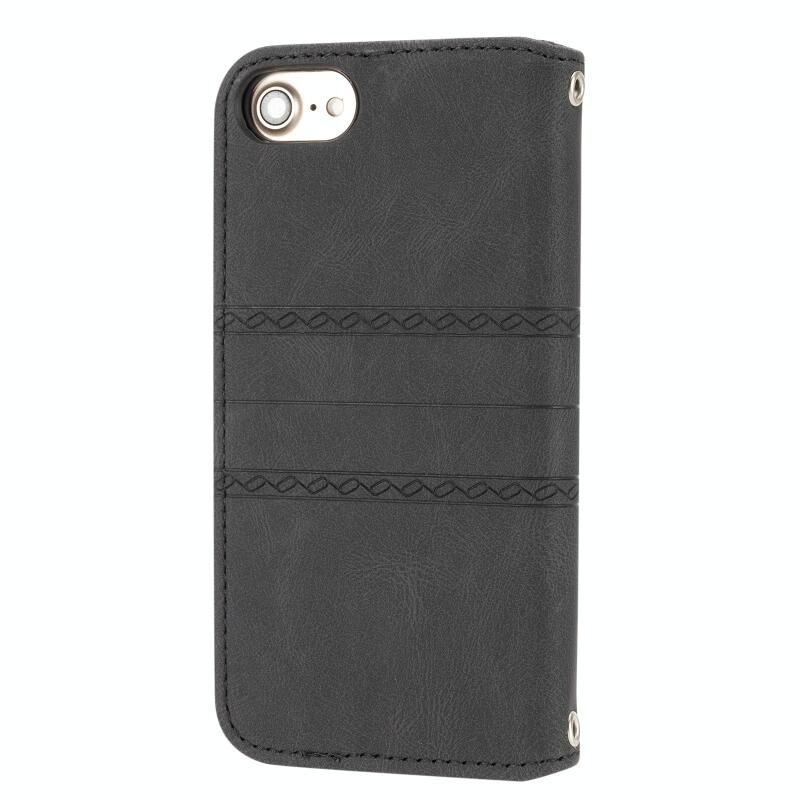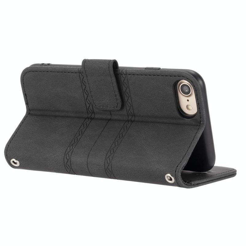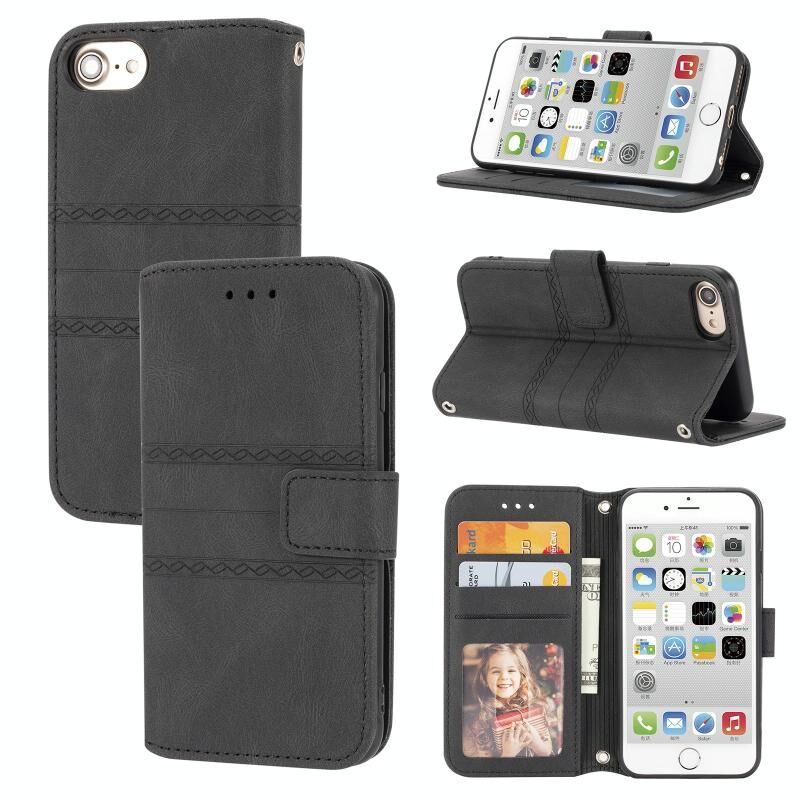 Θήκη δέρματος οριζόντιας αναδίπλωσης με μαγνητικό κούμπωμα και ανάγλυφο ριγέ σχέδιο για iPhone 8 / 7 / 6, με βάση, θήκη για κάρτες, πορτοφόλι, κορνίζα φωτογραφιών και λουρί (Μαύρο)
