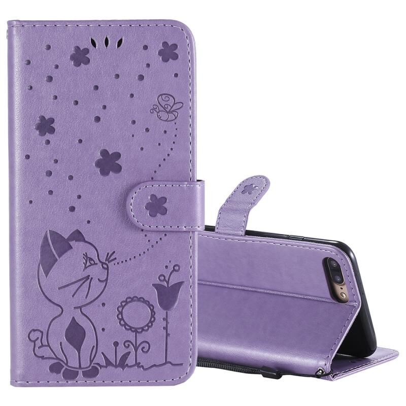 For iPhone 8 Plus / 7 Plus Cat Bee Embossing Pattern Shockproof Horizontal Flip Leather Case with Holder & Card Slots & Wallet(Purple)