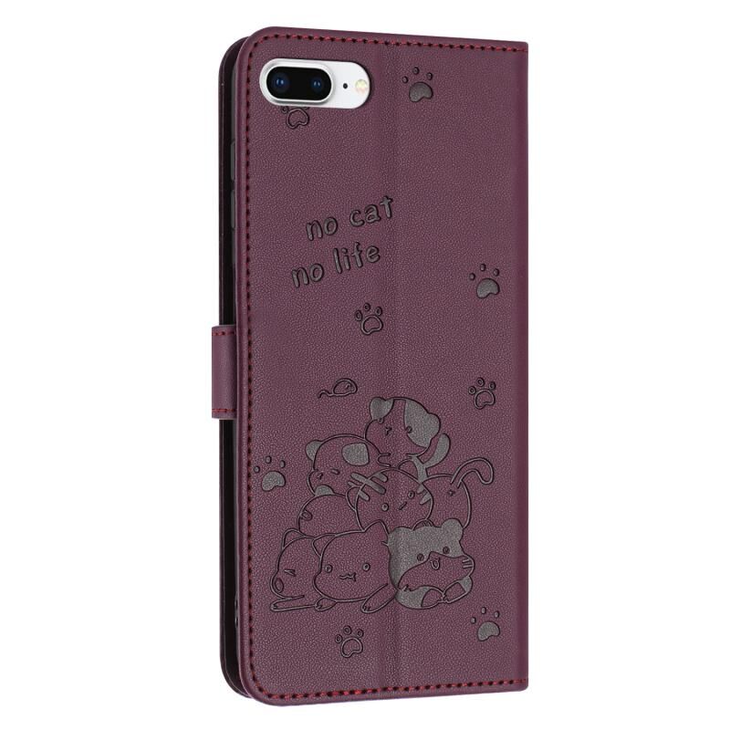 Θήκη δερμάτινη για iPhone 8 Plus / 7 Plus με ανάγλυφο γατάκι και κορδόνι (Μωβ)