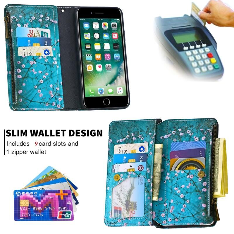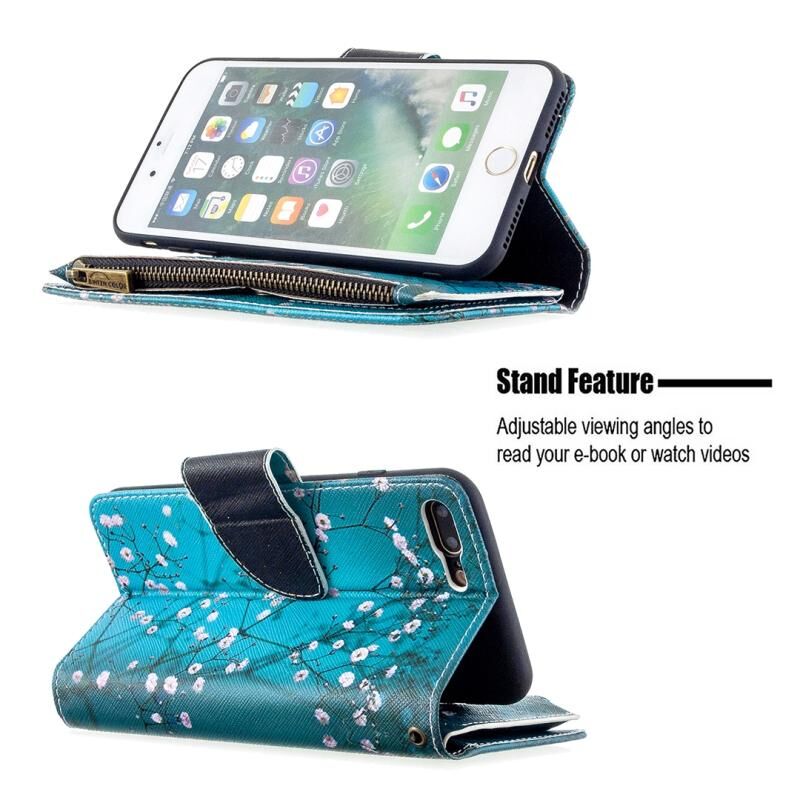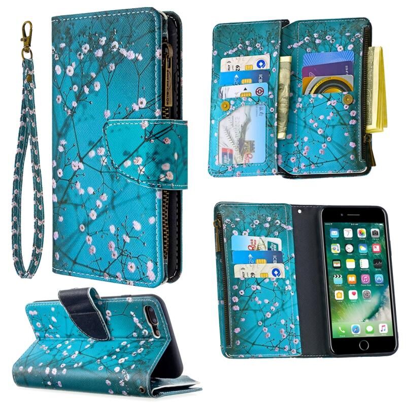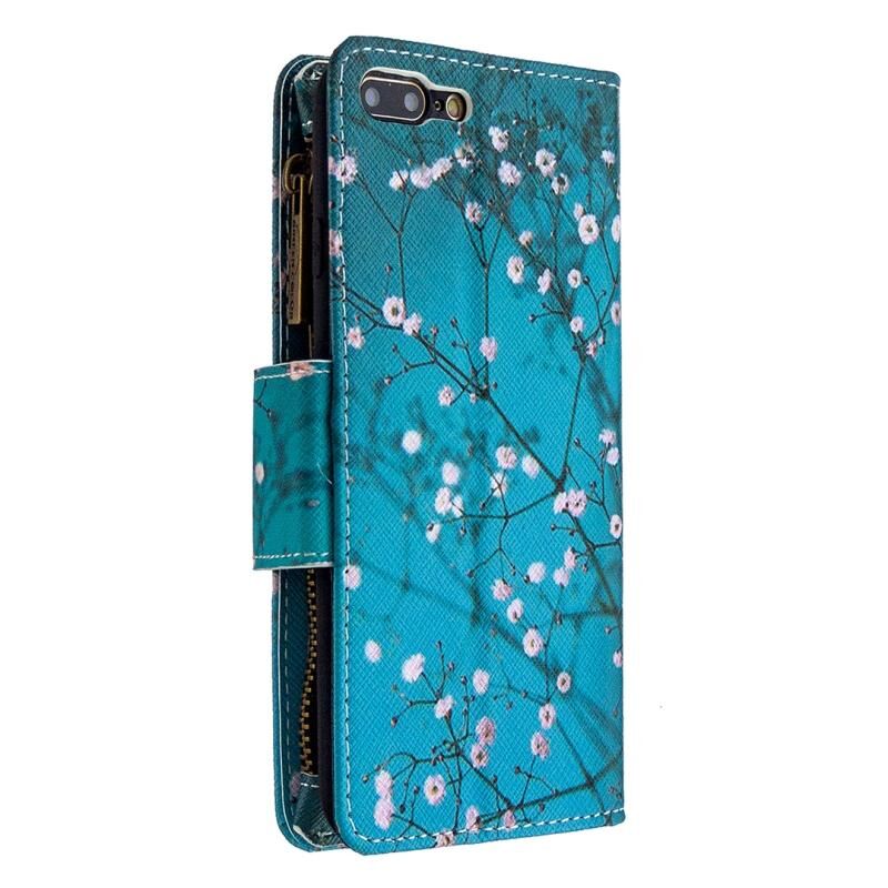 Θήκη δέρματος οριζόντιας αναδίπλωσης με φερμουάρ, με σχέδιο ζωγραφικής σε χρώμα, για iPhone 8 Plus & 7 Plus, με βάση & θήκες καρτών & πορτοφόλι (Λουλούδι Δαμασκηνιάς)