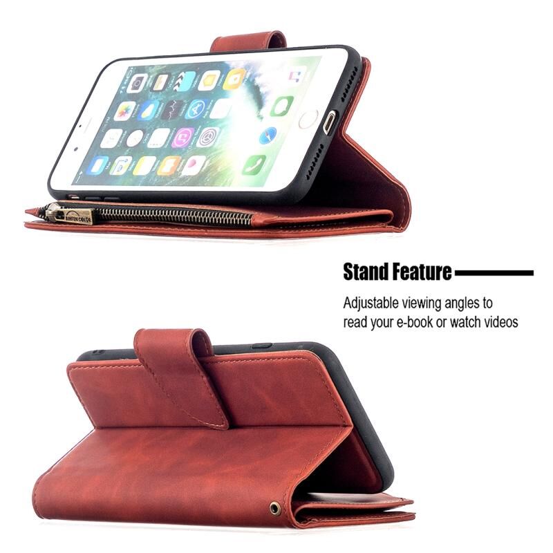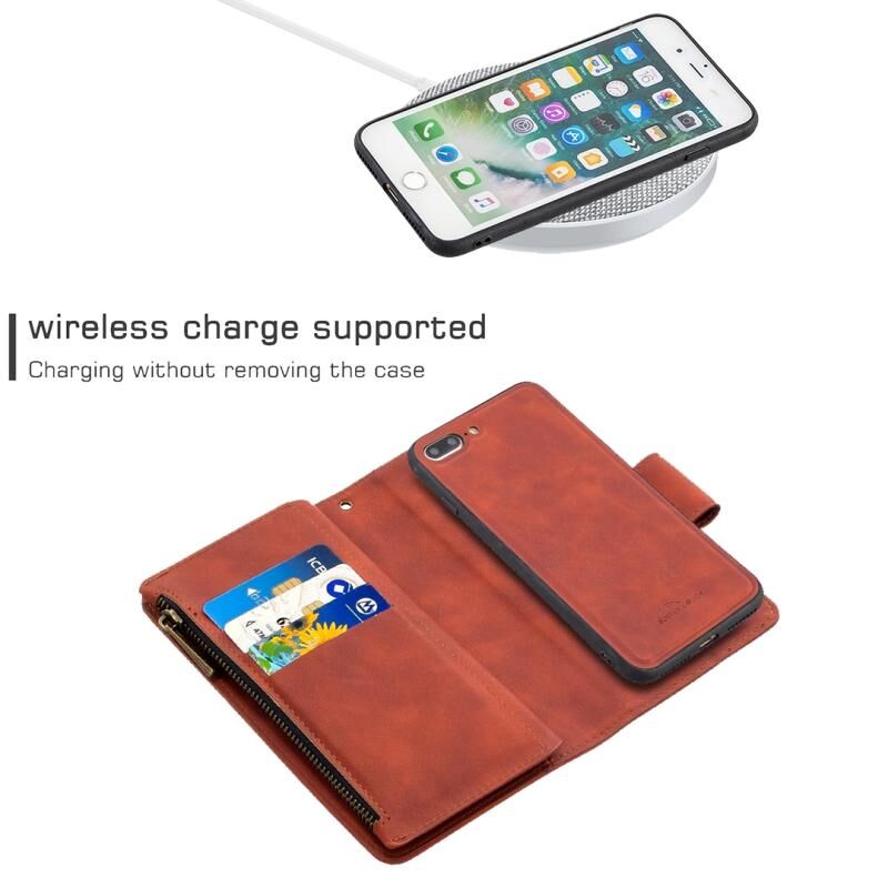 Θήκη για iPhone 8 Plus με αίσθηση δέρματος, αποσπώμενη, μαγνητική, οριζόντια, με φερμουάρ, από δερματίνη PU, με πολλαπλές θήκες για κάρτες, βάση, πορτοφόλι, κορνίζα φωτογραφιών & λουρί (Καφέ)