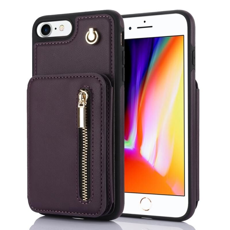 Θήκη κινητού τηλεφώνου με φερμουάρ και διπλό κορδόνι για iPhone SE 2022 / 2020 / 8 / 7 YM006 με αίσθηση δέρματος (Σκούρο Μωβ)