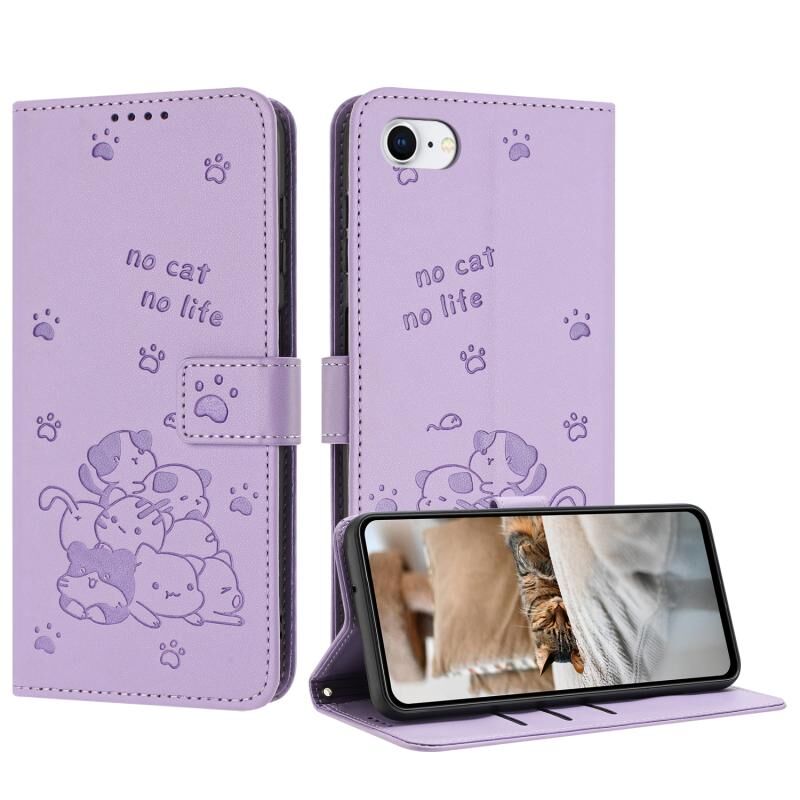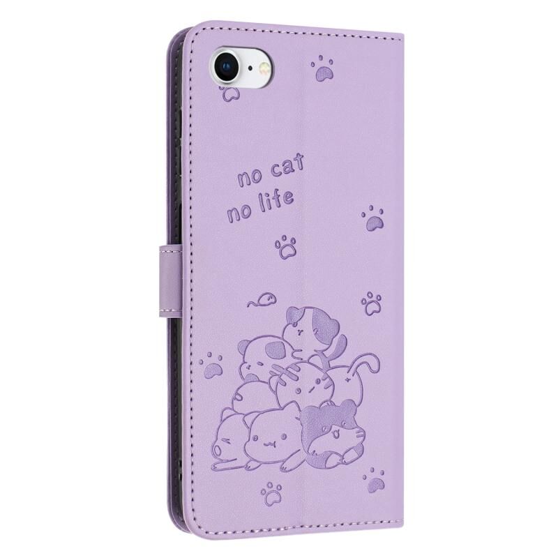 Θήκη δερμάτινη για iPhone SE 2022 / 2020 με ανάγλυφο σχέδιο γατάκι και κορδόνι (Μωβ)